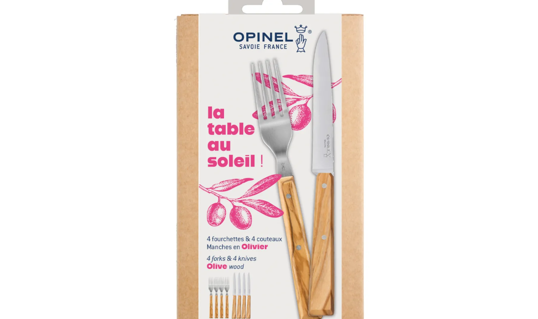 Il est composé de 4 fourchettes Sylve olivier et 4 couteaux Bon Appétit olivier. Un bois au veinage unique qui évoque le soleil du sud. La fourchette et la lame du couteau sont en acier inoxydable.