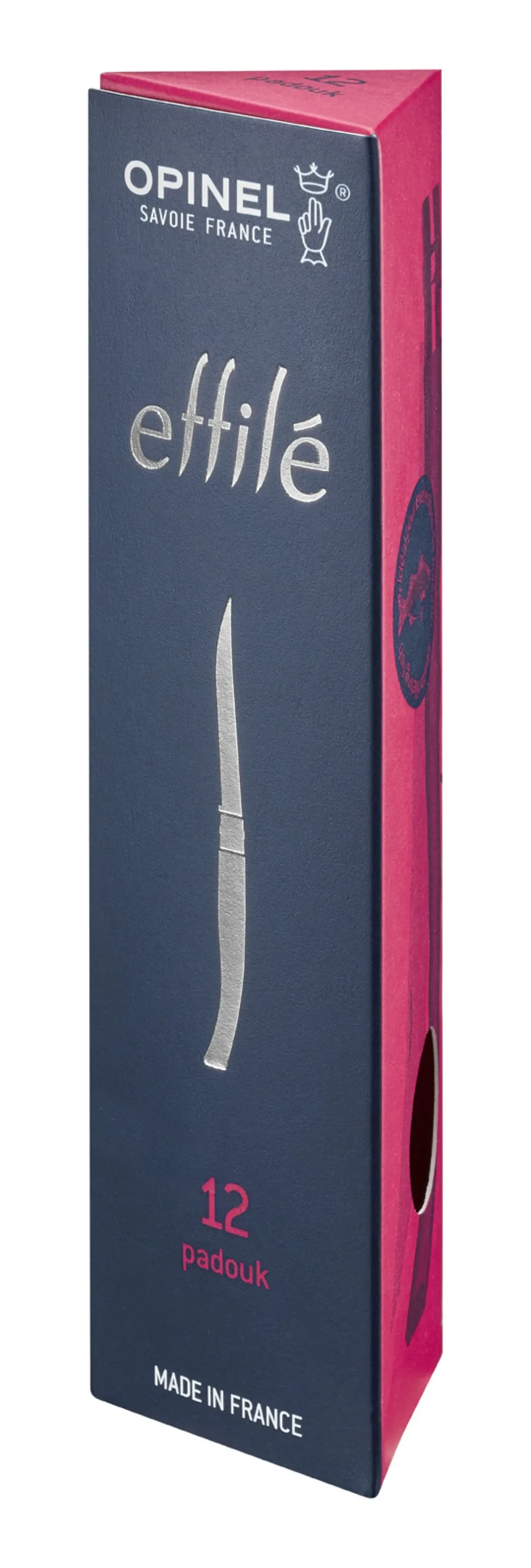L’effilé 12 padouk nouvelle version conserve son design d’origine : un manche épuré en padouk, une lame poliglace de 12 cm permettant de couper finement et avec précision. La virole est maintenant frappée du nouveau logo des effilés.