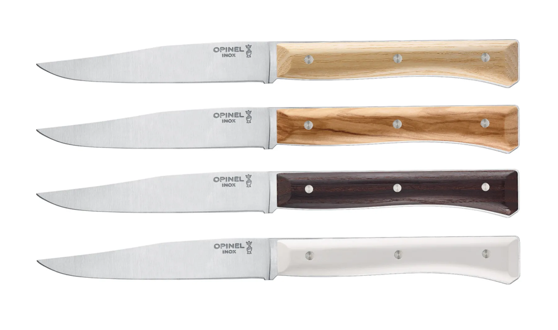 Quatre couteaux avec une lame lisse pleine soie en acier inoxydable. Aucun aliment ne résistera ! Quatre manches avec des bois et matériaux différents : des bois naturels avec le frêne et l’olivier, un bois stabilisé avec le frêne sombre, et un éco-matériau VittEr® en papier compressé qui passe au lave-vaisselle.