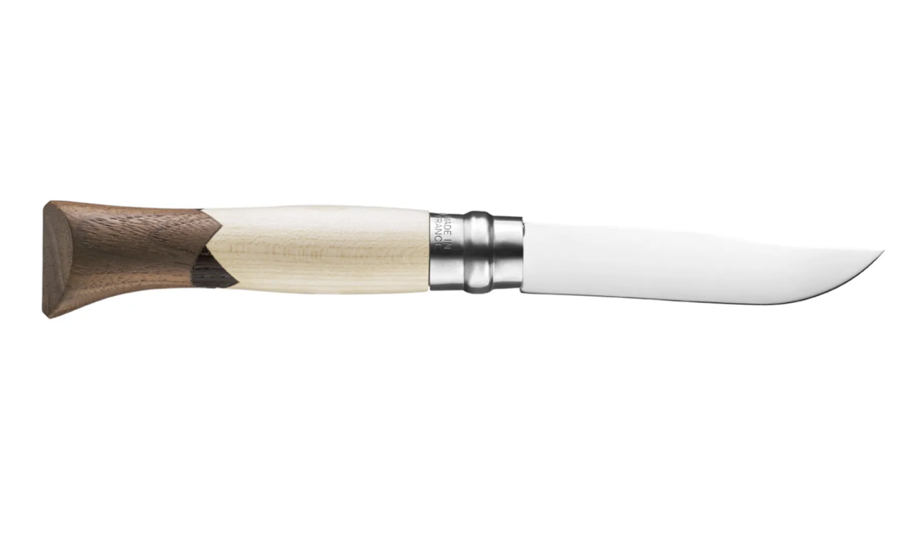 Il est équipé d’une lame de 9 cm en acier inoxydable et d’un manche réalisé par l’assemblage de trois bois français aux couleurs contrastées : l’érable sycomore, le frêne thermochauffé et le noyer noir. Il possède également une virole de sécurité pour bloquer la lame en position ouverte ou fermée.
