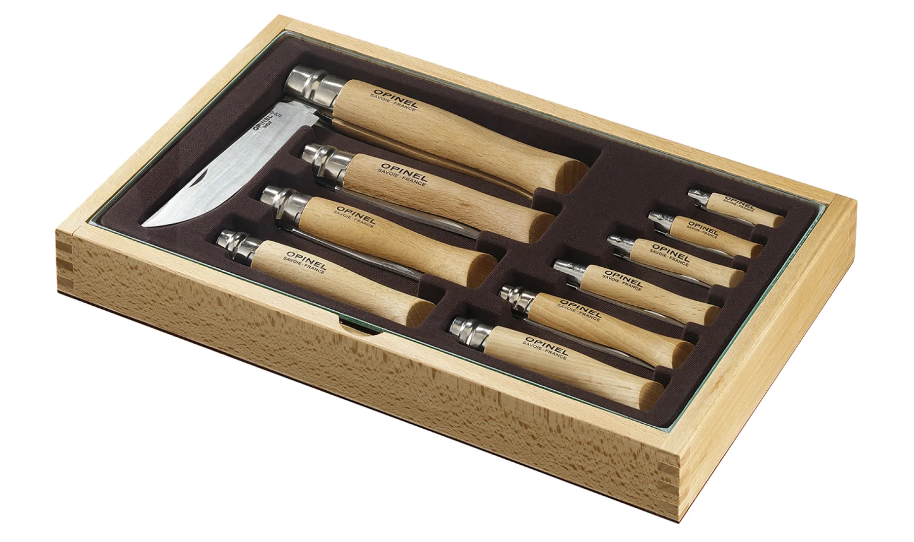 Pour les collectionneurs, le coffret réunit les 10 couteaux de la gamme Tradition dans un coffret en bois avec vitre transparente.
